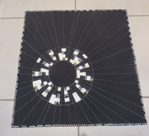 This past summer I registered, through The Modern Quilt Guild, to participate in a quilt challenge.  If selected I would receive a bundle of fabric in the mail and I would have to sew it into a quilt and submit it by November 30.  Well, I was chosen, the fabric arrived, and then it sat.  The colours didn’t move me, inspiration was lacking.  Eventually I came up with a plan and got to work.  It started to take shape and looked promising.  Then we went away for two weeks and arrived home three days before the deadline.  It was completed and submitted, online, with only hours to spare.  Here’s the piece – it’s 25″ x 26″ and I’m pretty happy with how it turned out.